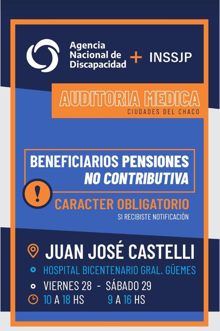 Un equipo de profesionales médicos realizará las auditorías a aquellas personas beneficiarias de pensiones no contributivas que fueron notificadas mediante carta documento. El operativo se realizará en el Hospital del Bicentenario este viernes 28 de marzo de 10 a 18 horas; mientras que el día sábado continuará de 9 a 16 horas.