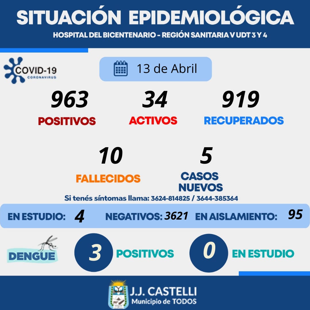 La escalada de casos comenzó el 5 de abril y en apenas 8 días Castelli pasó de tener 9 casos activos a un total de 34 de acuerdo con el informe oficial de este martes 13 . Si bien la situación parece estar controlada, las alertas de una nueva ola están vigentes y pareciera ser que las autoridades locales esperan que el panorama se complique para adoptar medidas de prevención.