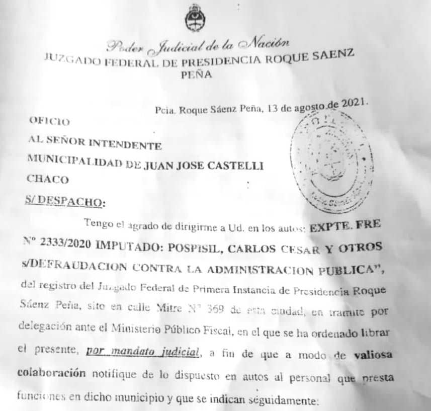 Desde el Juzgado Federal de Primera Instancia de Roque Sáenz Peña, se notificó al Intendente Pío Oscar Sander sobre la Resolución emitida de ese Tribunal Federal donde se imputa a 53 empleados de la municipalidad (entre ellos algunos en la función pública como Coordinadores), por defraudación contra la Administración Pública.