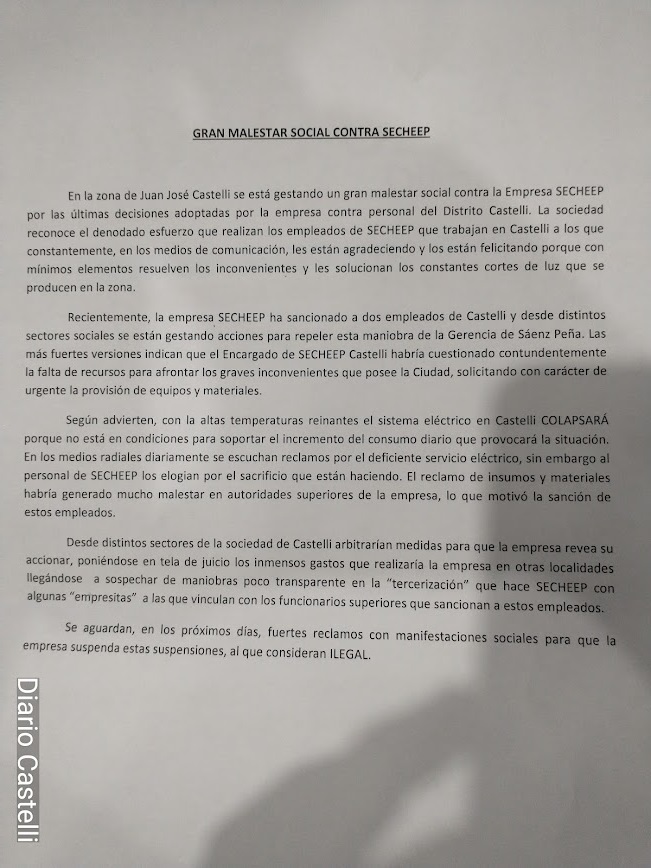 A través de un comunicado, empleados de Secheep de Castelli denunciaron que la empresa Secheep sancionó a dos empleados de Castelli por haber reclamado mayores recursos logísticos e insumos para garantizar los servicios en esta localidad.
