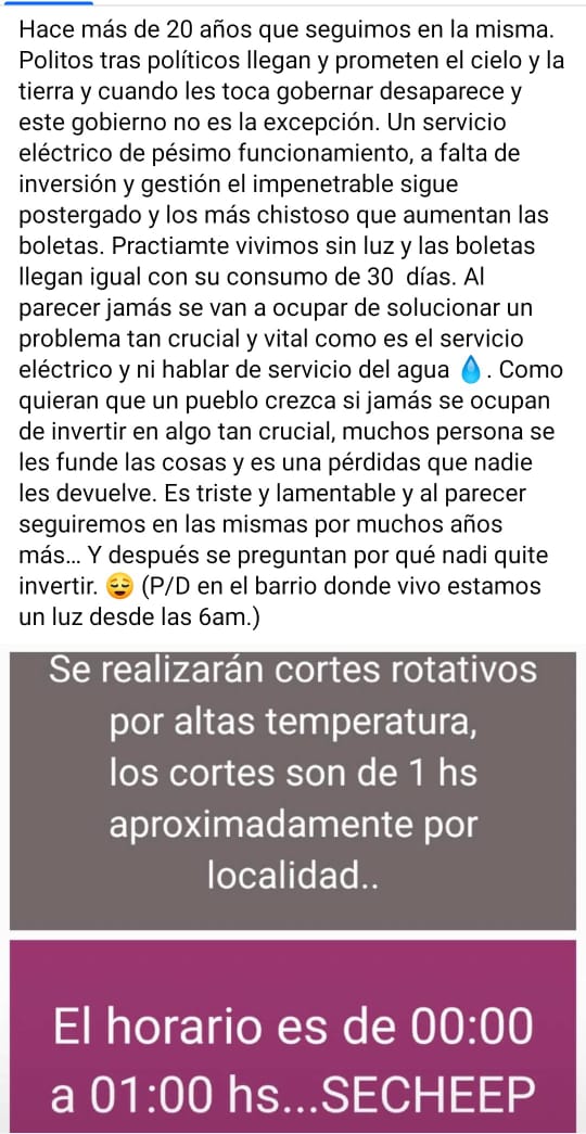 «Hace más de 20 años que seguimos en la misma, políticos tras políticos llegan y prometen el cielo y la tierra, y cuando les toca gobernar desaparece; y esta no es la excepción», expresó un usuario indignado. Describió que la empresa Secheep brinda «un servicio eléctrico de pésimo funcionamiento a falta de inversión y gestión sigue postergado, y lo más chistoso es que aumentan las boletas de luz». Además se preguntó «¿cómo quieren que un pueblo crezca si no se ocupan de invertir en algo tan crucial , a muchas personas se les funden las cosas y es algo que nadie les devuelve?. Es triste y lamentable, y al parecer seguiremos en las mismas por muchos años más»expresó.
