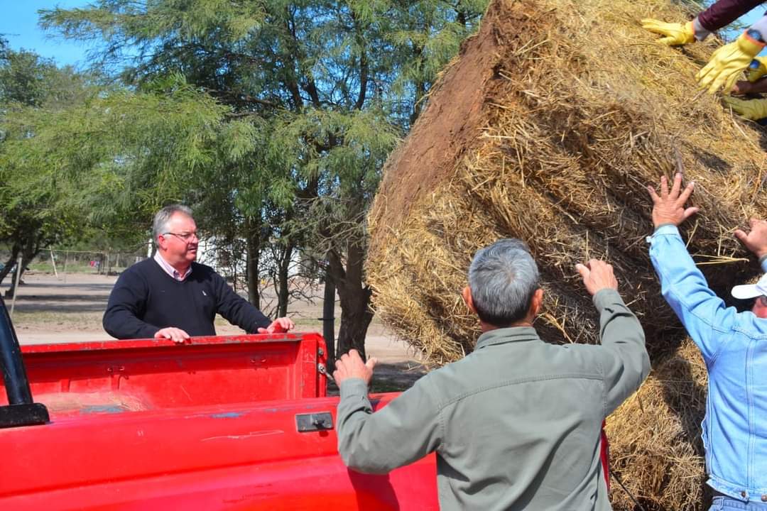 El intendente Pío Sander, junto a la secretaria de Producción y Desarrollo Local Jessica Kloster y la delegada municipal Mariana López, entregó pastura a productores locales afectados por la sequía, en una iniciativa para abordar la escasez de alimento para los animales.