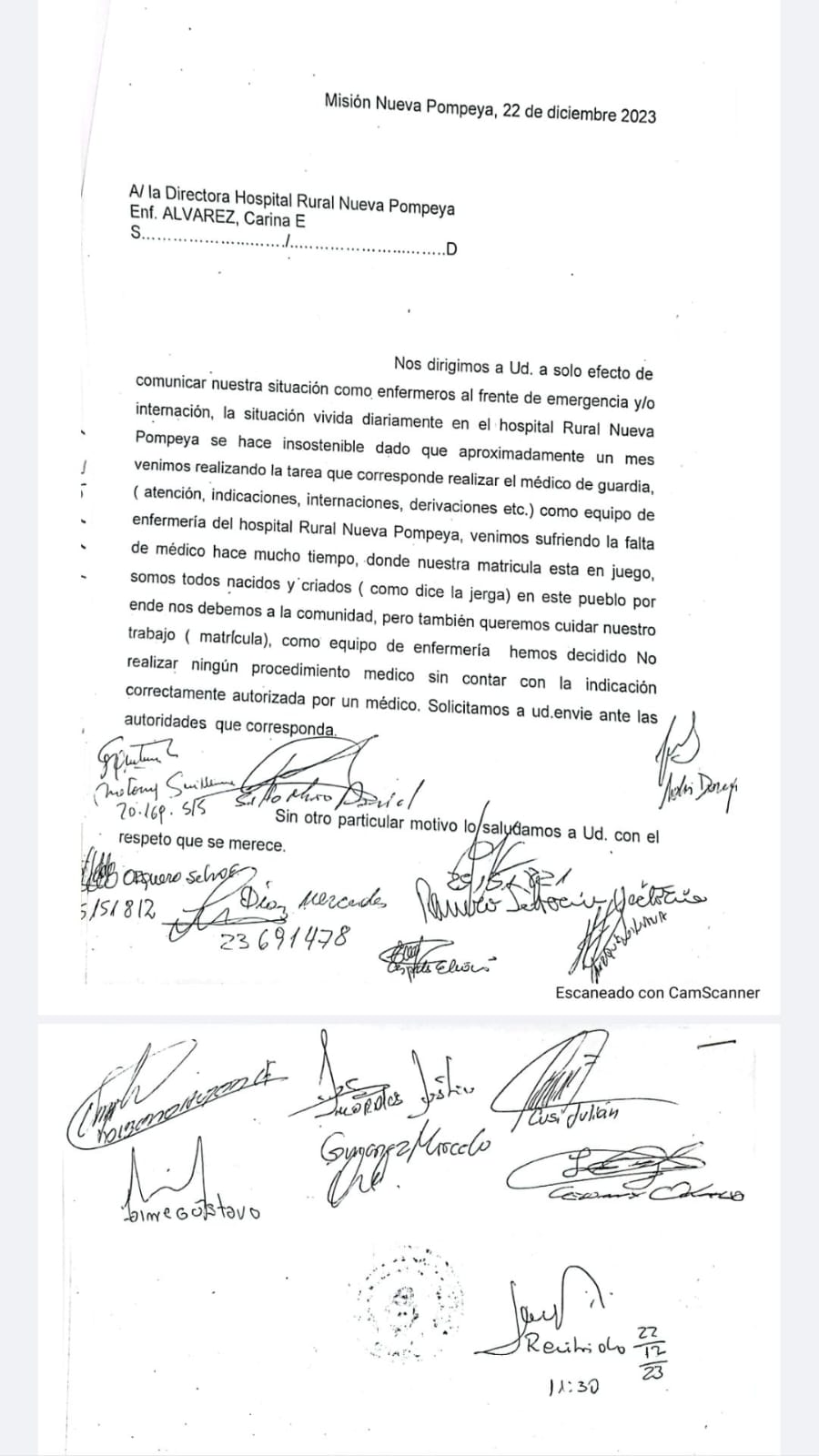 La nota está firmada por 14 trabajadores de salud que plantean una situación dramática respecto a la faltante de profesionales médicos, y aseguran que son ellos quienes tienen que cubrir esa función para la que no están facultados legalmente. En ese sentido, aseguran que «como equipo de enfermería del hospital Rural de Nueva Pompeya, venimos sufriendo la falta de médico desde hace mucho tiempo donde nuestra matrícula está juego». Agregan que «somos nacidos y criados en este pueblo, por ende nos debemos a nuestra comunidad, pero también queremos cuidar nuestro trabajo, y como equipo de enfermería hemos decidido no realizar ningún procedimiento sin contar con la indicación correctamente firmada por un médico«.