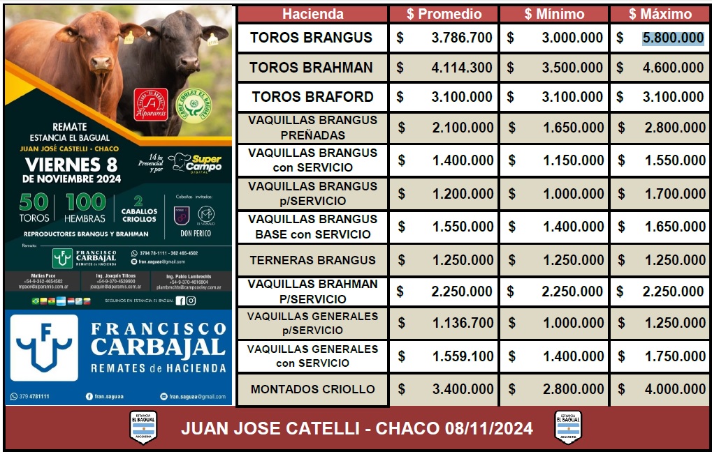 En términos generales, se lograron buenos promedios de precios en las ventas, destacándose un valor máximo de $ 5,8 millones que un cabañero pagó por un reproductor Brangus. Por su parte, en Brahman, el precio máximo fue de $ 4,6 millones; mientras que en Braford el precio máximo fue de $ 3,1 millones.
