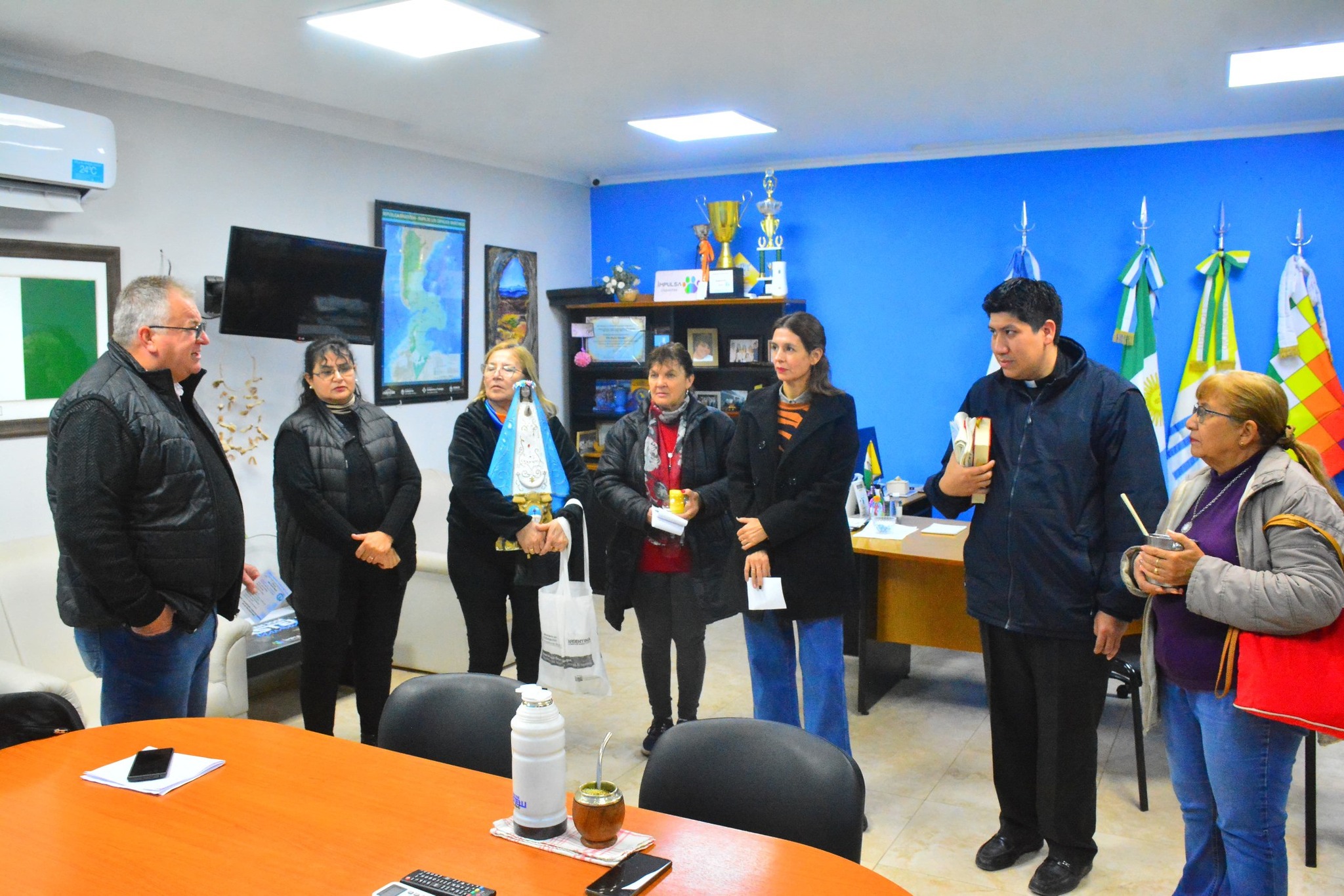 El intendente Pío Sander recibió en su despacho a feligreses, acompañados por el padre Ángel y la imagen de la Virgen. Juntos compartieron un momento de oración por el trabajo, por los funcionarios y por toda la comunidad.