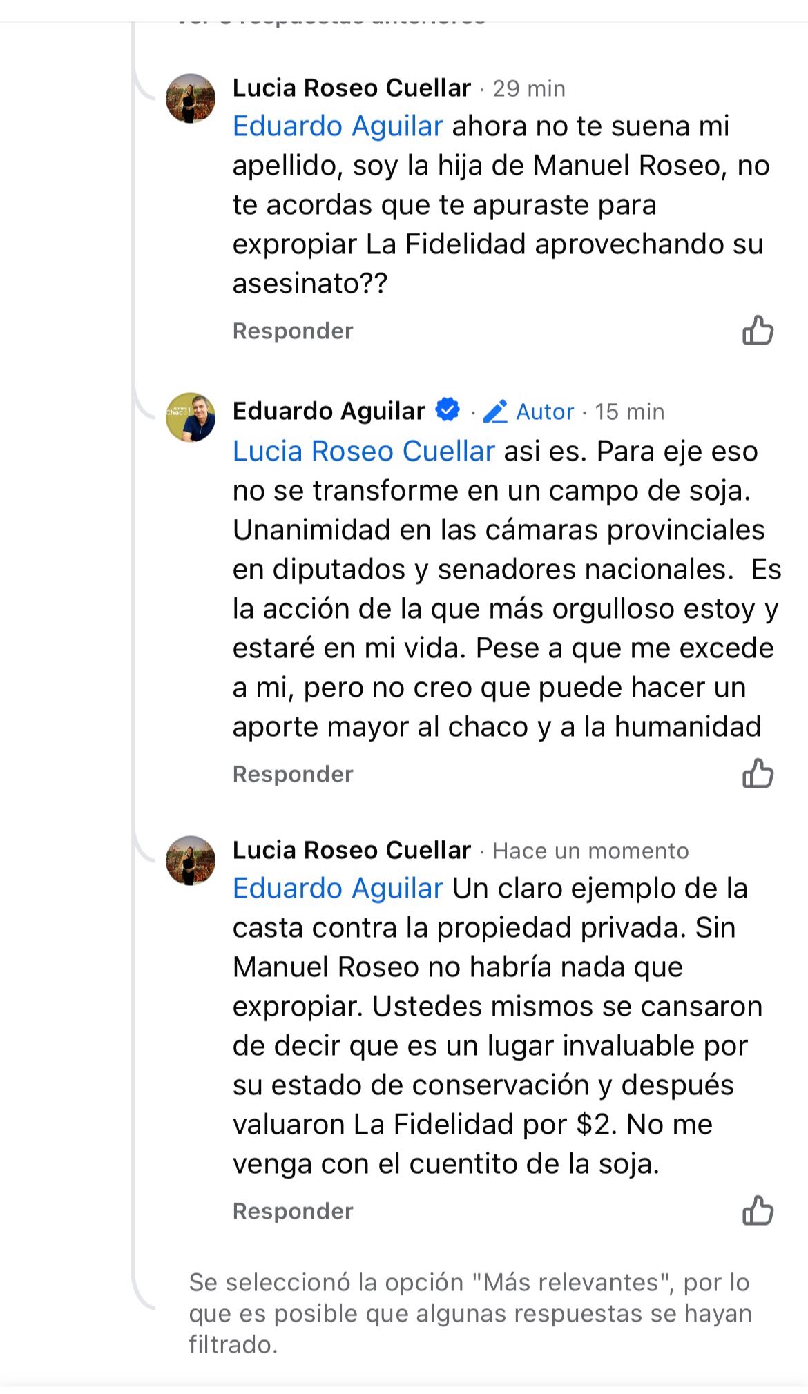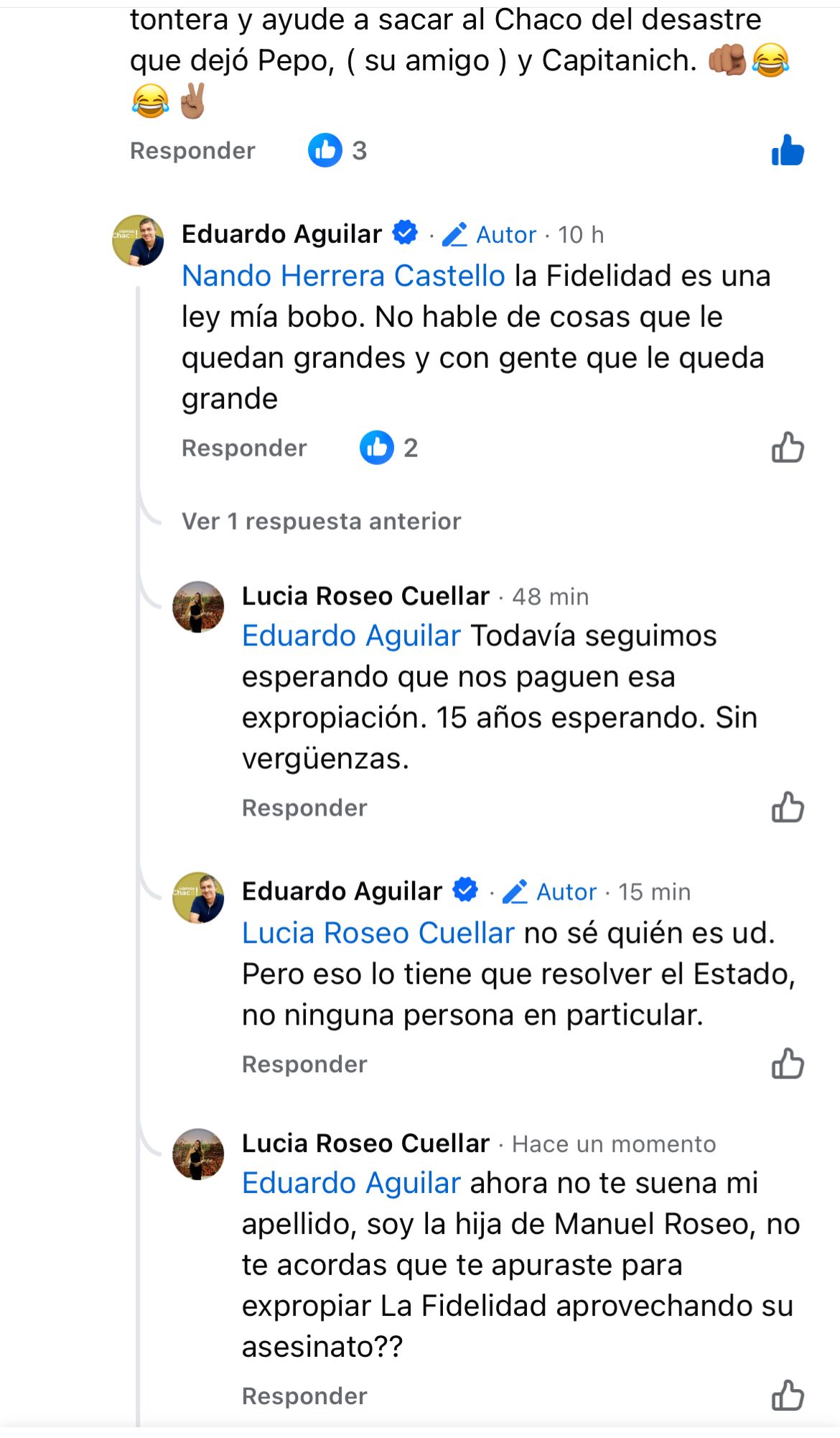 El fuerte cruce ocurrió luego de un posteo en Facebook del ex senador Eduardo Aguilar en el que propone la creación de un Ministerio del Impenetrable que planifique su desarrollo sumando a comunidades, organizaciones no gubernamentales y universidades. Inmediantamente, Lucía Roseo Cuellar, hija de Manuel Roseo, salió al cruce y lo trató de «Sin verngüenza», recordando la participación activa del ex legislador en el proyecto de expropiación de la estancia La Fidelidad en el año 2014.
