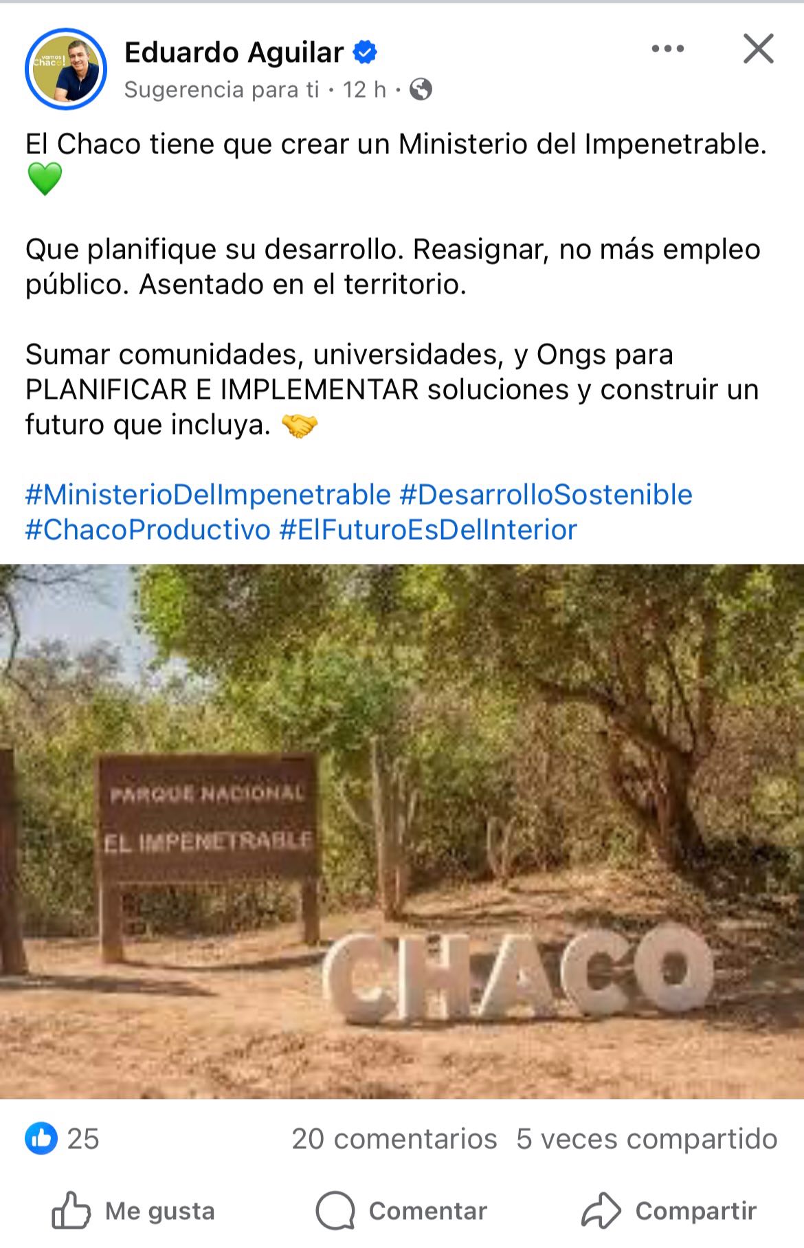 El Senador Eduardo Aguilar fue quien presentó el Proyecto de Ley por el cual se acepta la cesión de jurisdicción de la Provincia del Chaco al Estado Nacional de 150 mil hectáreas de monte nativo que conforman el Parque Nacional Impenetrable.