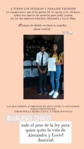 La concentración será a las 18 horas en la plaza central de esa localidad y luego se marchará hasta la delegación de Vialidad Provincial para pedir justicia. «Todo el peso de la Ley para quien quitó la vida de Alexandra y Lucio», expresa la convocatoria.