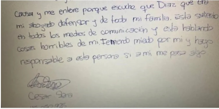 «Me entere que Diaz que era mi abogado defensor y de toda mi familia está saliendo en los medios y está hablando cosas horribles de mí. Tengo miedo por mí. Hago responsable a esta persona si me pasa algo a mí», dice la breve nota de Sena.
