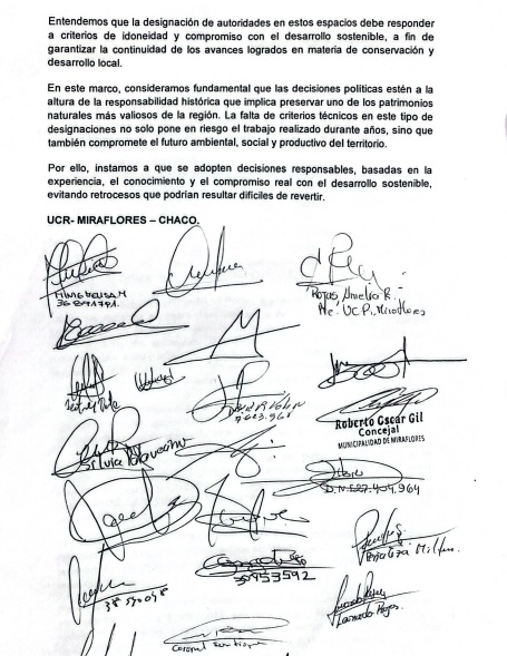 Según expresa un documento  remitido a  Diario  Castelli,  «recientes trascendidos sobre el perfil propuesto para la intendencia del área protegida encienden señales de alerta respecto a los criterios de selección», y advierte que «distintas voces advierten que una designación que no contemple estos requisitos podría poner en riesgo los avances logrados, afectar la continuidad de políticas de conservación y debilitar procesos construidos durante años con esfuerzo institucional y comunitario».