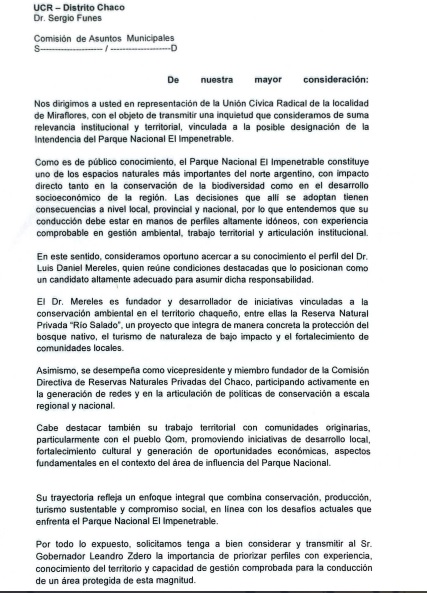 Por otro lado, desde la UCR Miraflores elevaron una nota al Dr Sergio Funes de la Comisión de Asuntos Municipales en la que proponen a Luis Daniel Mereles, para ocupar  el cargo en la Intendencia del Parque El Impenetrable que tiene su sede en la localidad de Miraflores. Sostienen que Mereles «reúne condiciones destacadas que lo posicionan comoun candidato altamente adecuado para asumir dicha responsabilidad».