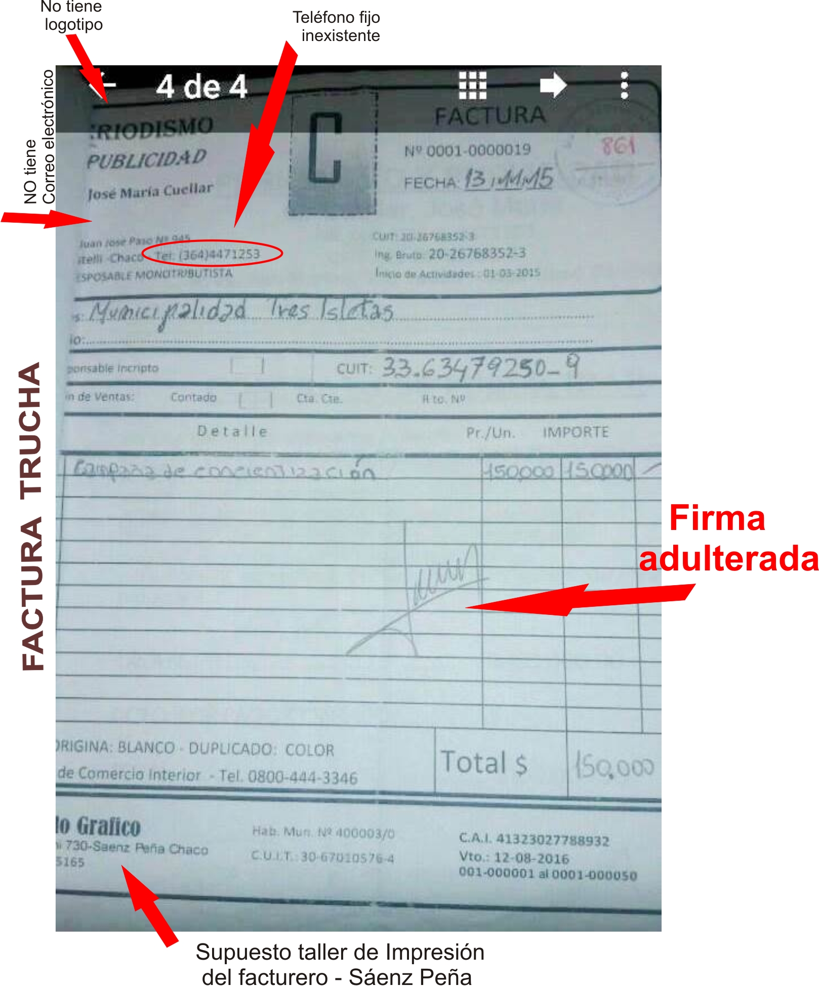 Entre esos elementos, una pericia oficial del IMCiF en septiembre del 2019 ratificó que el ex tesorero Aldo Mieri fue el autor de las adulteraciones de firmas, facturas y cheques cobrados al Municipio de Tres Isletas por servicios truchos de publicidad, que no se prestaron.