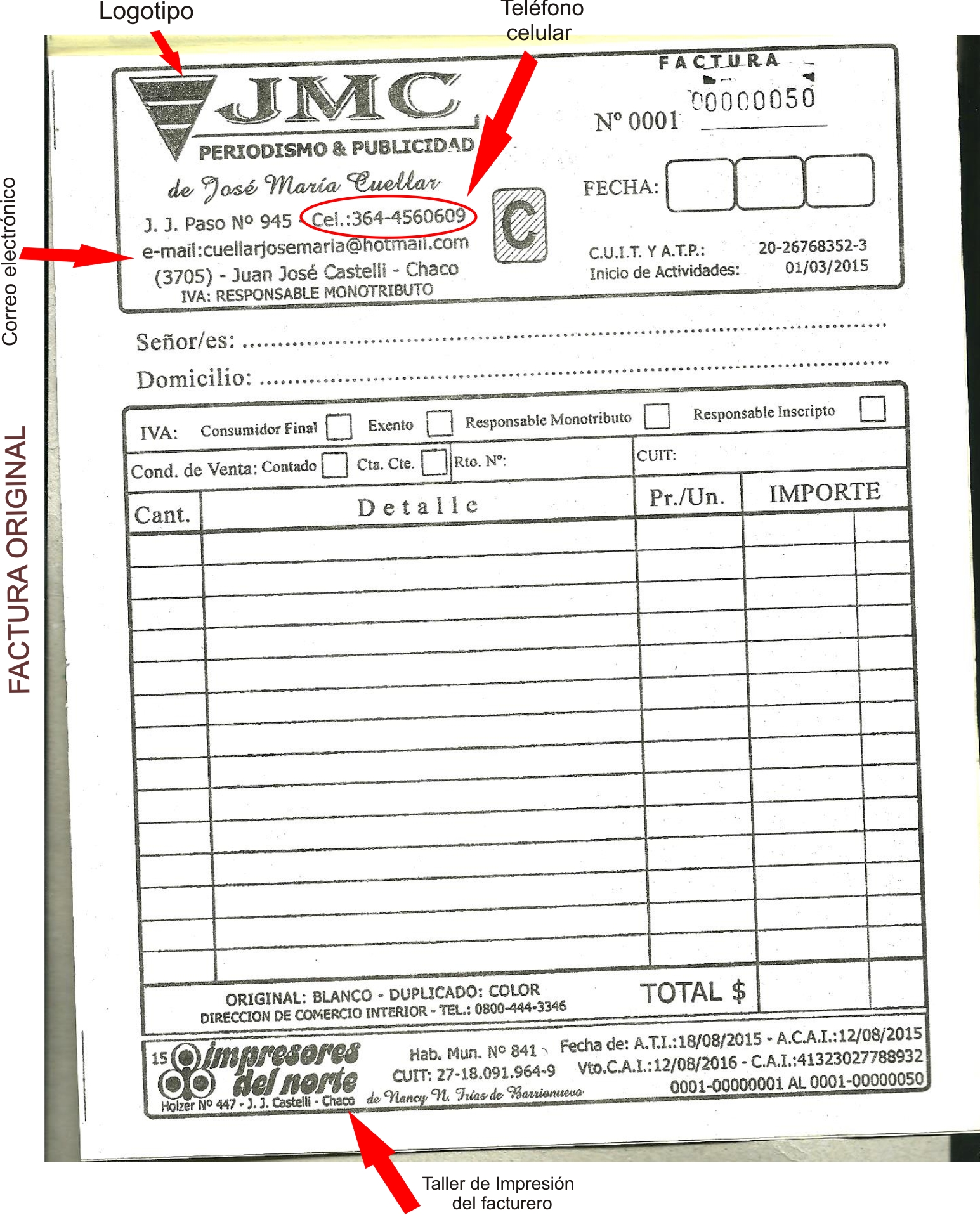 Un modelo de la factura original de la agencia de publicidad, que fue víctima de la falsificación. Según el INCiF, habría sido el ex funcionario Aldo Mieri el autor de la adulteración de la firma para concretar la facturación.
