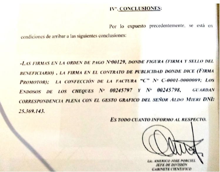 Según el máximo organismo científico del Poder Judicial del Chaco, Aldo Mieri habría sido el autor material de varias maniobras de falsificación de firmas, entre ellas de la orden de pago, un supuesto contrato de publicidad,  la confección de la factura C y los endosos de dos cheques cobrados en la sucursal del Banco Nación de Tres Isletas por la propia hermana de Mieri y por un subcontratista de la ciudad de Sáenz Peña. En las conclusiones, el IMCiF remarcó que estas adulteraciones “guardan correspondencia plena con el gesto gráfico del señor Aldo Mieri”.