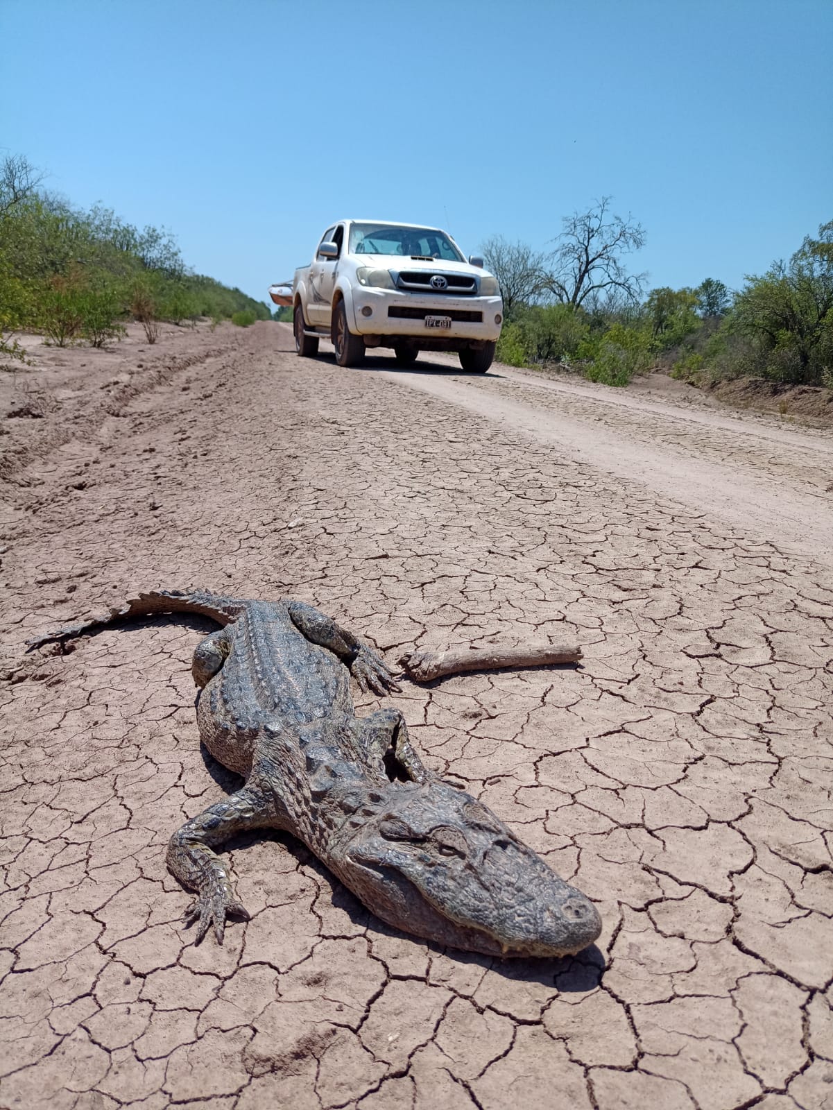 Cuando vimos a pocos metros nuestro lo que ve en imágenes, bajé de la camioneta para entender qué pasaba, quería correrlo de la ruta porque alguien más iba a pasar y lo iba aplastar. José en ese momento también se acercó a este yacaré y pudo ver la escena que yo ni había notado. Hacía muy poco minutos que había muerto queriendo cruzar la ruta y llegar del otro lado a una pequeña represa de agua por las imágenes que vemos, no llegó y estaba así todavía porque por lo general, no se los ve en la ruta y los pasan por encima.