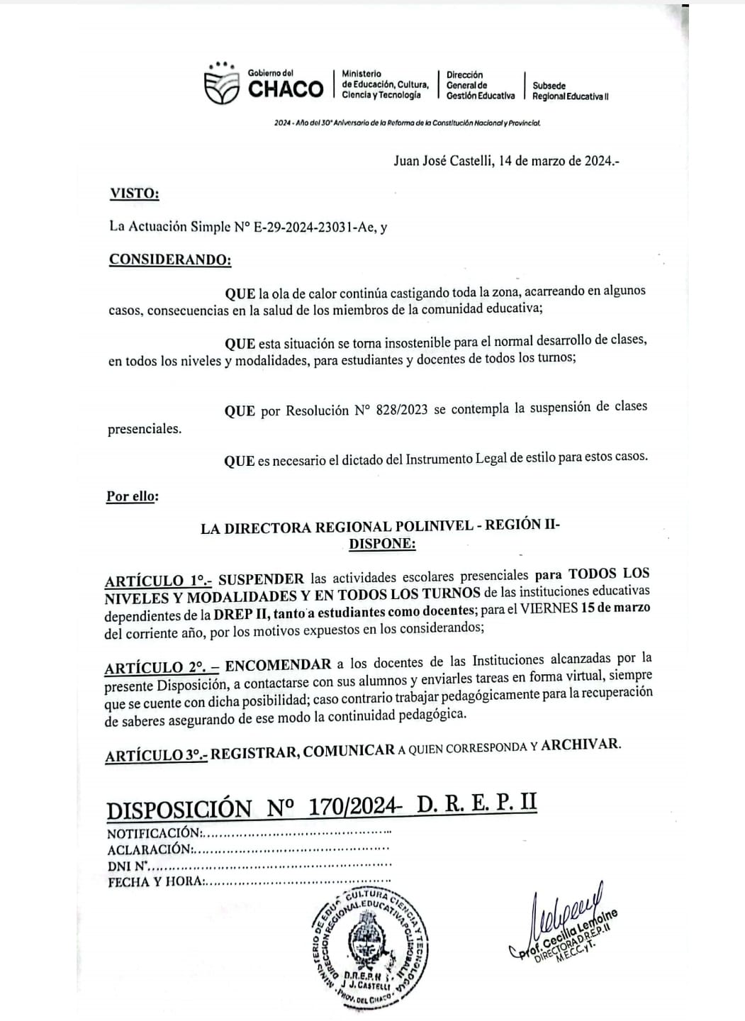 Mediante la Disposición N° 170/24 firmada por la Directora Regional, profesora Cecilia Lemoine, se encomienda a los docentes tomar contacto con sus alumnos y enviarles actividades en forma virtual en caso de ser posible; o de lo contrario trabajar posteriormente para compensar los contenidos.