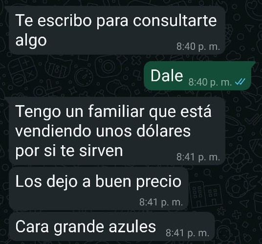 Pero también algunos estafadores ofrecen vender dólares a precio accesible en el mercado, y para ello solicitan la trasnferencia del dinero equivalente a la cantidad de dólares que la víctima quiera comprar.