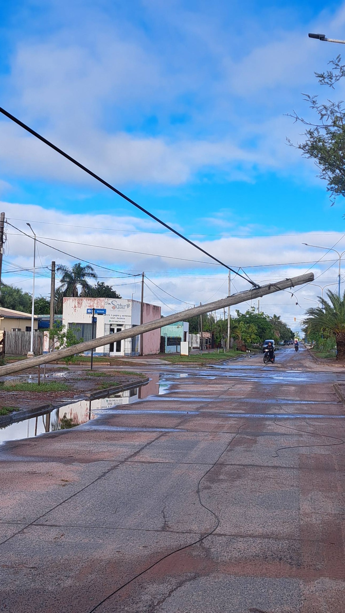 Como consecuencia de los fuertes vientos, varios postes de telefonía cedieron y quedaron colgados de los cables hacia la calle, lo que representaun gran peligro para los automovilistas .