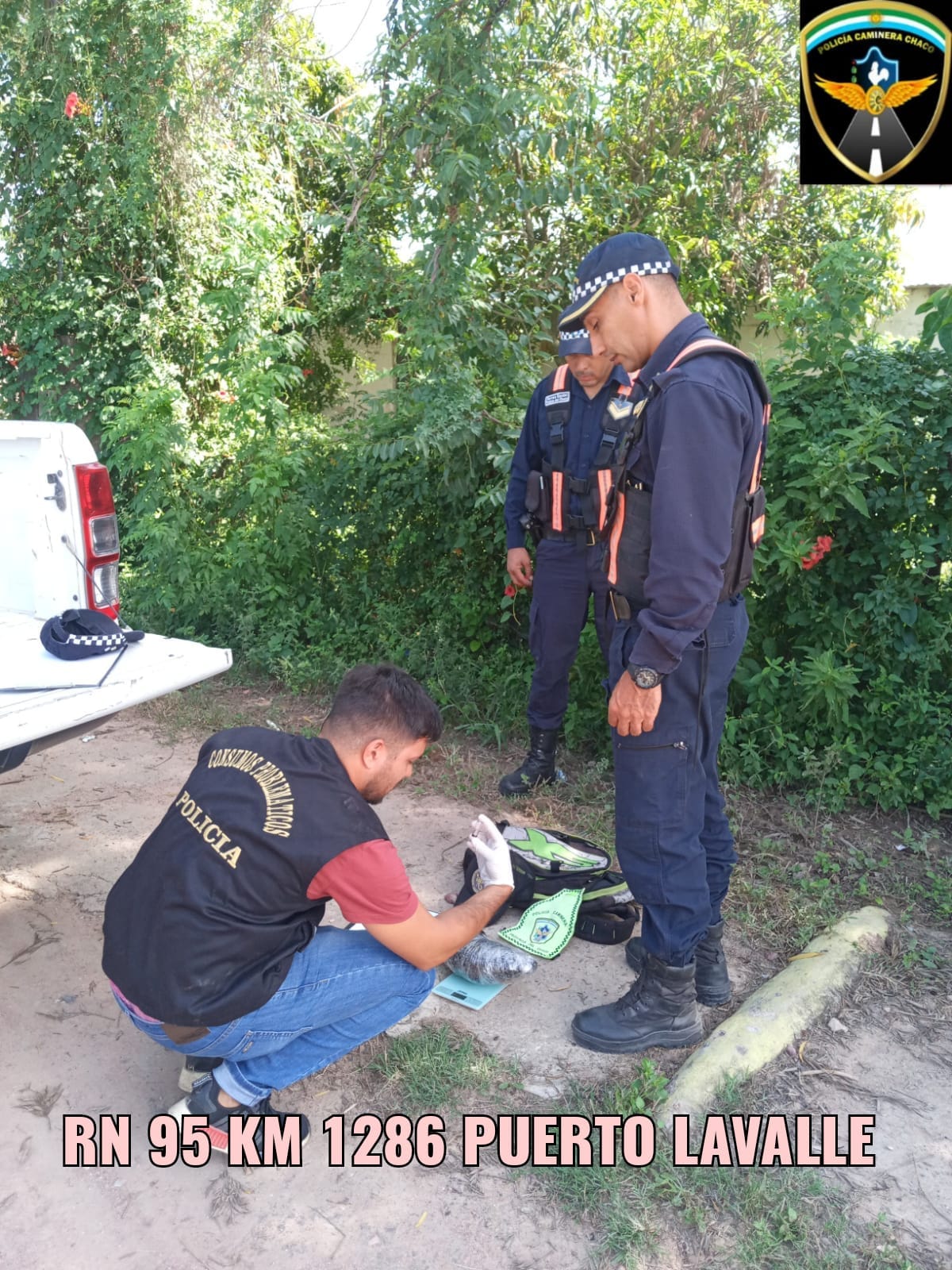 Esta mañana, efectivos de la División Tránsito Urbano y Patrilla Vial, realizaban un control vehicular a la altura del kilómetro 1986 de la Ruta Nacional 95, a escasos metros del puente limítrofes que separa a la vecina provincia de Formosa, cuando observan venir una persona masculina conduciendo una motocicleta tipo 125 cc. que del territorio formoseño ingresaba al chaqueño, y al sorprenderse de la presencia de los uniformados, arroja un envoltorio, evade el puesto policial y comienza veloz fuga, ingresado a los caminos lindante del lugar, logrando perder a la persecución policial.