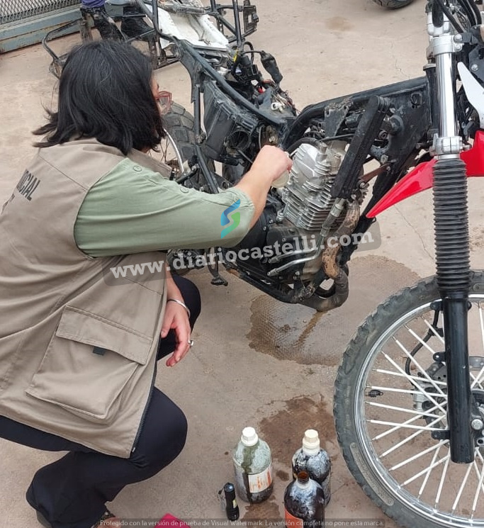 De acuerdo con las investigaciones, tanto el motor como otros elementos secuestrados en este domicilio particular, entre ellos ruedas, horquillón, frenos, tablero y llavero, pertenecerían a dicho rodado marca Yamaha XTZ 250 c.c., color azul, identificada como XTZ-38 que en su momento el Ministerio de Seguridad entregó a las fuerzas policiales de Castelli.