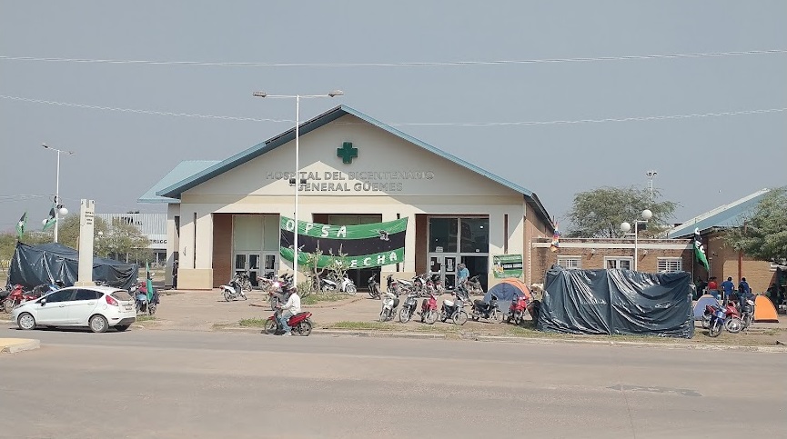 Manifestantes de la organización social Opsa Mecha mantienen el acampe en el acceso principal al hospital de Castelli, pidiendo que se les garantice la fuente laboral de los trabajadores de la cooperativa que prestaba servicio de limpieza en el nosocomio.