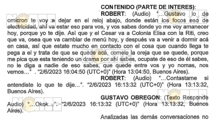Obregón , también, refirió «el bulto». El siguiente mensaje fue: » Asi que César va a Colonia Elisa con la Riti, creo que va, o sea que va a cambiar de menú hoy y después va a venir a dormir acá en casi, asi que estate mucho en contacto con él, cosa que cuando llegue te pegás a él y tratá de que se quede acá».