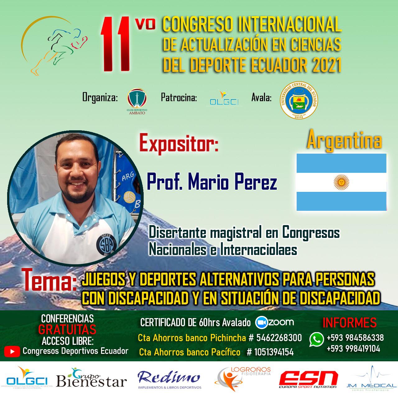 A la fecha Mario Pérez lleva disertando en dos Congresos Mundiales, cuatro Congresos Internacionales, dos Congresos Nacionales y varias Capacitaciones en varias Provincias de la Argentina. Además el 6 de mayo tendrá una ponencia para Perú y el 7 la Universidad UCCFD Manuel Fajardo de Cuba