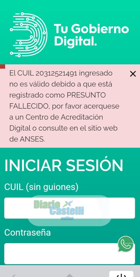 El insólito hecho se conoció cuando la damnificada intentó ingresar el día viernes desde su teléfono celular a la página oficial de “Tu Gobierno Digital” para realizar un trámite personal; y sorpresivamente se encontró con una inscripción que decía “El CUIL ingresado no es válido debido a que está registrado como presunto fallecido. Por favor, acérquese a un Centro de Acreditación Digital o consulte en el sitio web de Anses”.