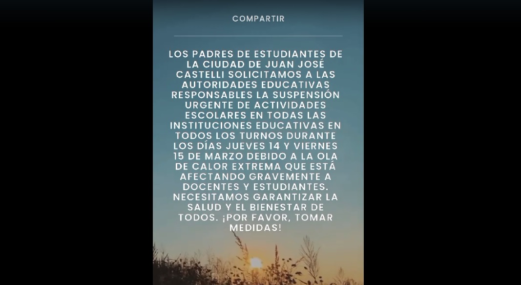 Mediante un mensaje viral que circula en grupos de WhatsApp, padres y tutores piden la suspensión total de las actividades escolares en todos los turnos  hasta el día viernes inclusive, debido a las altas temperaturas que afectan a la región.